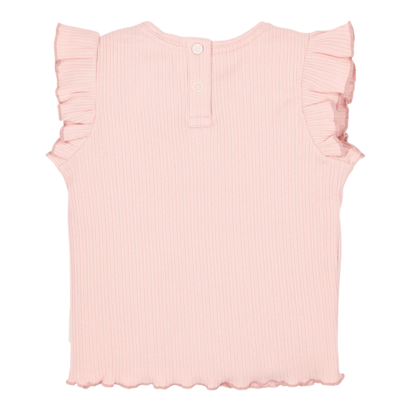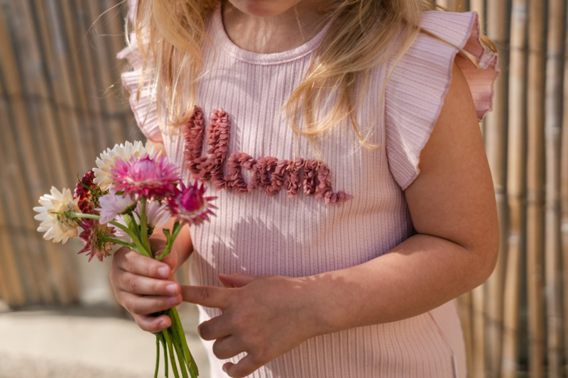 OverzichtLaat je meisje stralen in dit mouwloze shirt in zachte roze tint. De comfortabele ribstof met fijne structuur en lieve ruches op de schouders geven een speelse touch. Het 3D 'bloom' artwork op de borst maakt het extra bijzonder. Gemaakt van biologisch katoen, heerlijk zacht voor de gevoelige huid. Perfect voor zomerse dagen vol avontuur.
